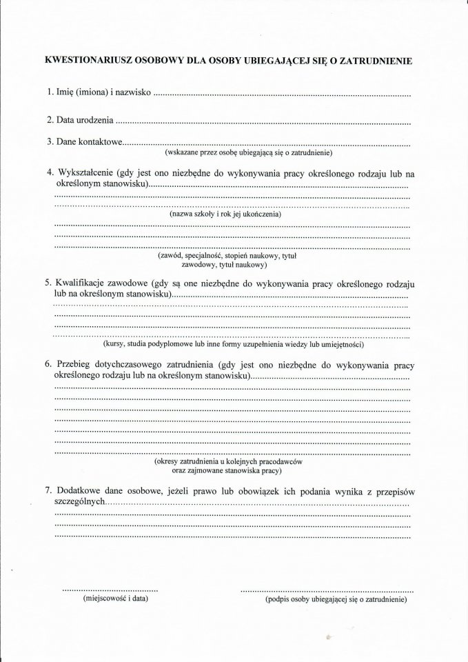 2) kwestionariusz osobowy dla osoby ubiegającej się o zatrudnienie (załącznik nr 1);