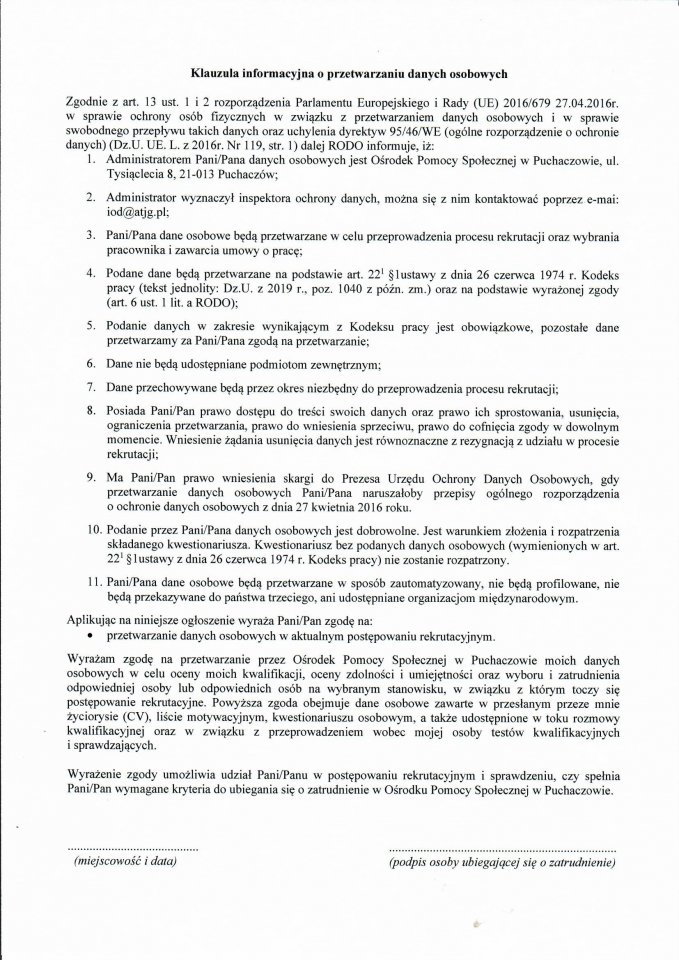 3) Dokumenty aplikacyjne kandydatów, którzy nie zostaną zatrudnieni, a także oferty niespełniające wymogów formalnych, niepodpisane, niekompletne, przesłane po terminie nie będą rozpatrywane. Dokumenty te mogą zostać odebrane w siedzibie OPS w Puchaczowie przez okres 3 miesięcy od zakończenia rekrutacji, po tym czasie zostaną komisyjnie zniszczone.
