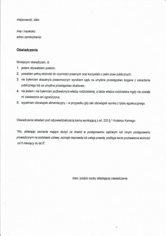 - kandydata, że nie był skazany prawomocnym wyrokiem sądu za umyślne przestępstwo lub umyśle przestępstwo skarbowe.