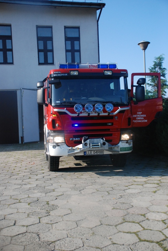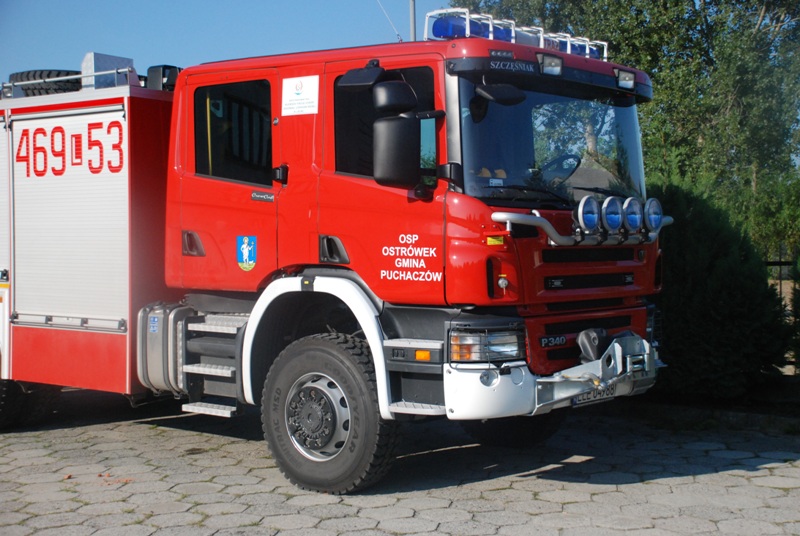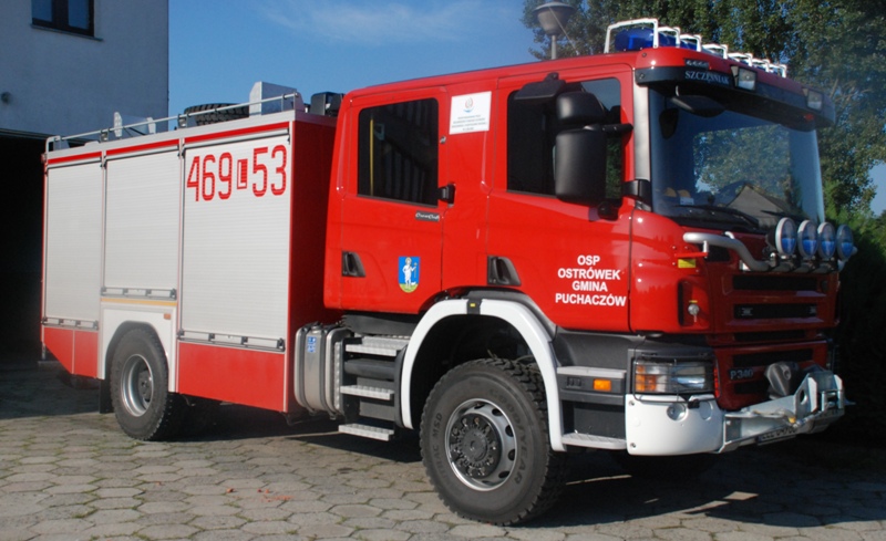 Jedzie, jedzie straż ogniowa, trąbka gra sam komendant dziś prowadzi wóz. Straż ogniowa to jednostka Ochotniczej Straży Pożarnej w Ostrówku a wóz, to nie byle jaki zaprzęg - to nowiutka Scania P340 CB 4x4. Takim właśnie pojazdem od poniedziałku jednostka straży ogniowej w Ostrówku będzie jeździła do pożarów oraz innych akcji wymagających interwencji ratowników. Pojazd „zaprzężony” jest w 340 koni Mechanicznych oraz posiada zbiornik na wodę o pojemności 5 000 litrów, jednym słowem konie mają, co ciągnąć. Uterenowiony napęd na obie osie (4x4) ułatwi dojechanie tym samochodem do najbardziej niedostępnych zakątków gminy Puchaczów. Oznaczenie pojazdu to GCBA 5/32.